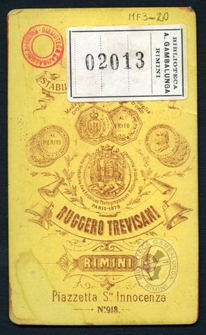 Dettaglio del documento Condividi Trova il documento in altre risorse ???scheda.servizi.button??? Permalink Il permalink è stato copiato, puoi utilizzarlo immediatamente.E’ sufficiente premere i tasti “Ctrl+v” per posizionarlo dove preferite. Stampa titolo Facebook Twitter [Ritratto di uomo] Trevisani, Ruggero <1843-1906> Fotografia 1879 Scrivi una recensione e condividila con gli altri lettori. Biblioteche Dettagli Link Commenti afp002274 - Ruggero Trevisani, Ritratto di uomo, dopo il 1879. afp002274v - Ruggero Trevisani, Ritratto di uomo, dopo il 1879 (verso) https://scoprirete.bibliotecheromagna.it/SebinaOpac/resource/RAV1401777
